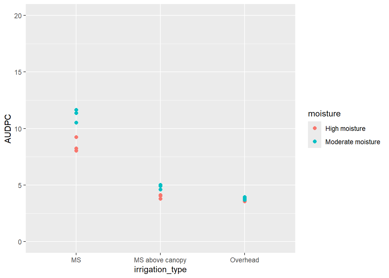 ggplot(aes(irrigation_type, AUDPC, color = moisture)) +