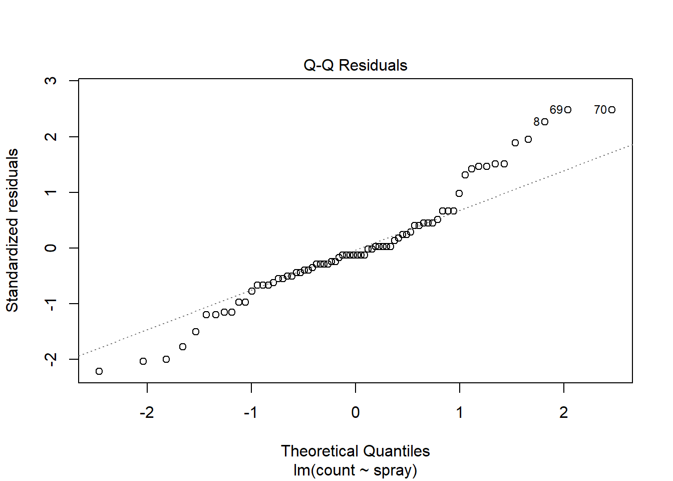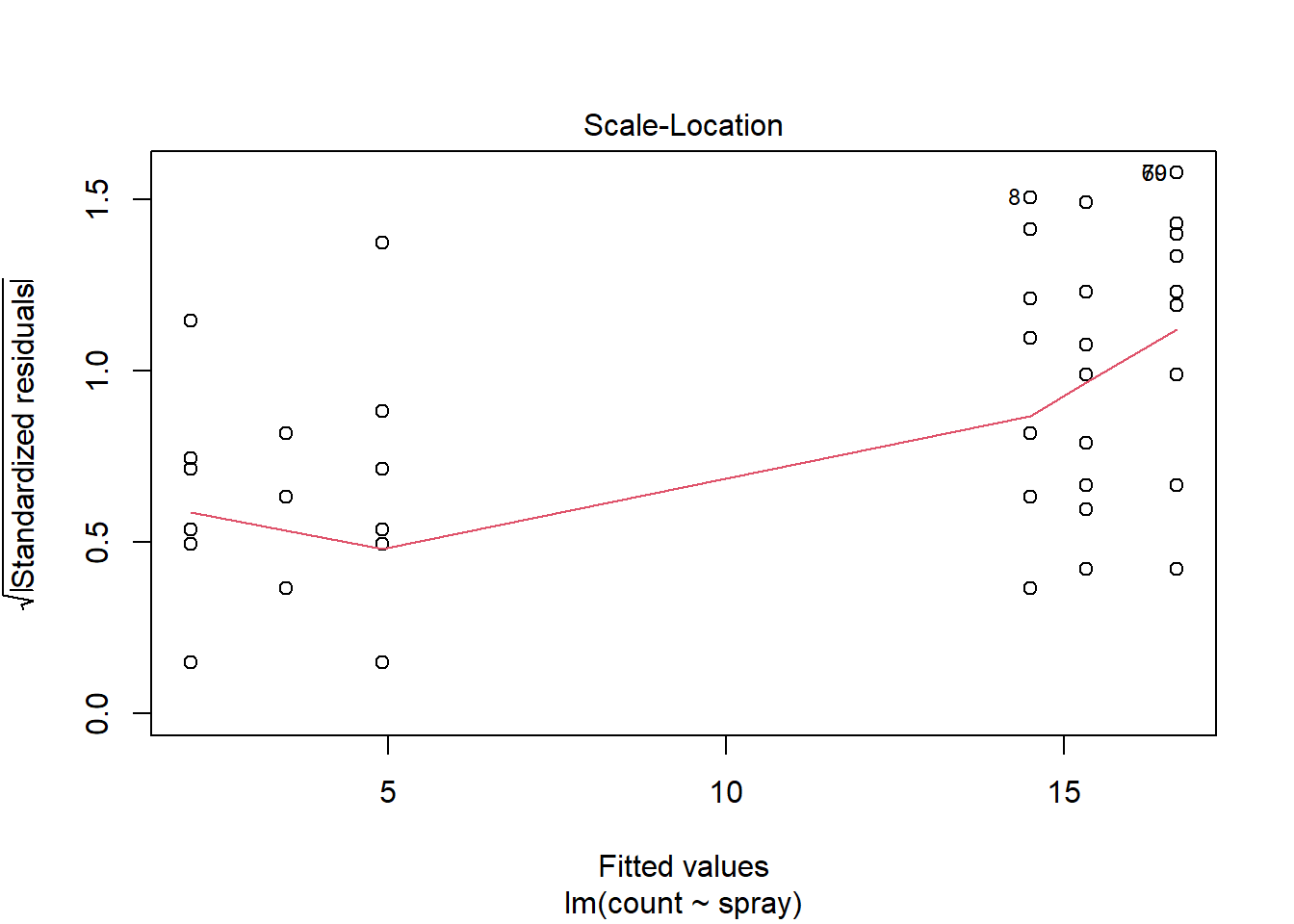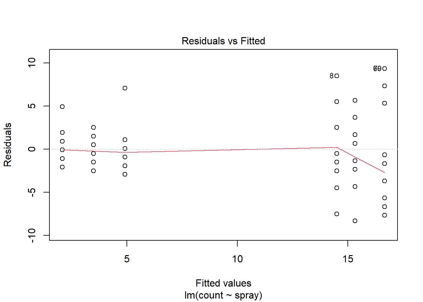 m4 <- glm(count ~ spray, data = insetos, family = poisson)Após o ajuste, a análise de variância pode ser realizada com a função Anova() do pacote car, que retorna diretamente os valores-p (diferente da função base anova(), que mostra apenas os desvios):