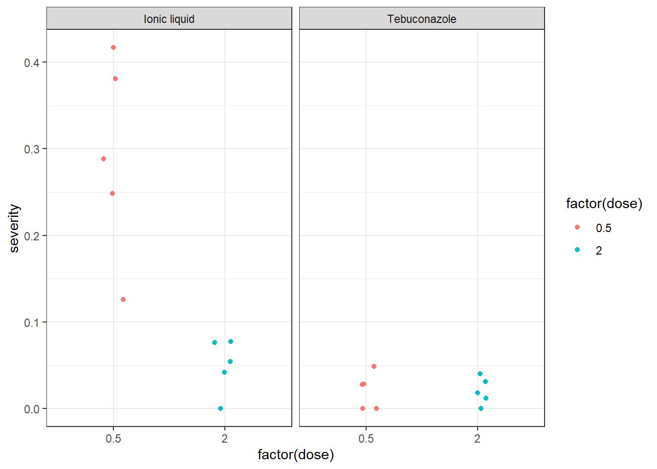ggplot(aes(factor(dose), severity, colour = factor(dose))) +