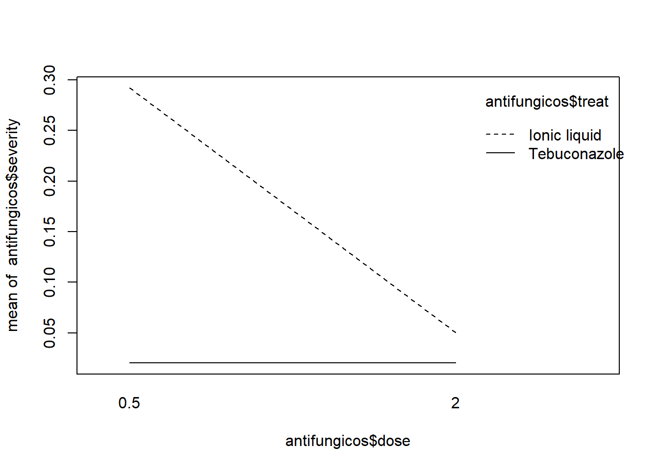 interaction.plot(antifungicos$dose, antifungicos$treat, antifungicos$severity)