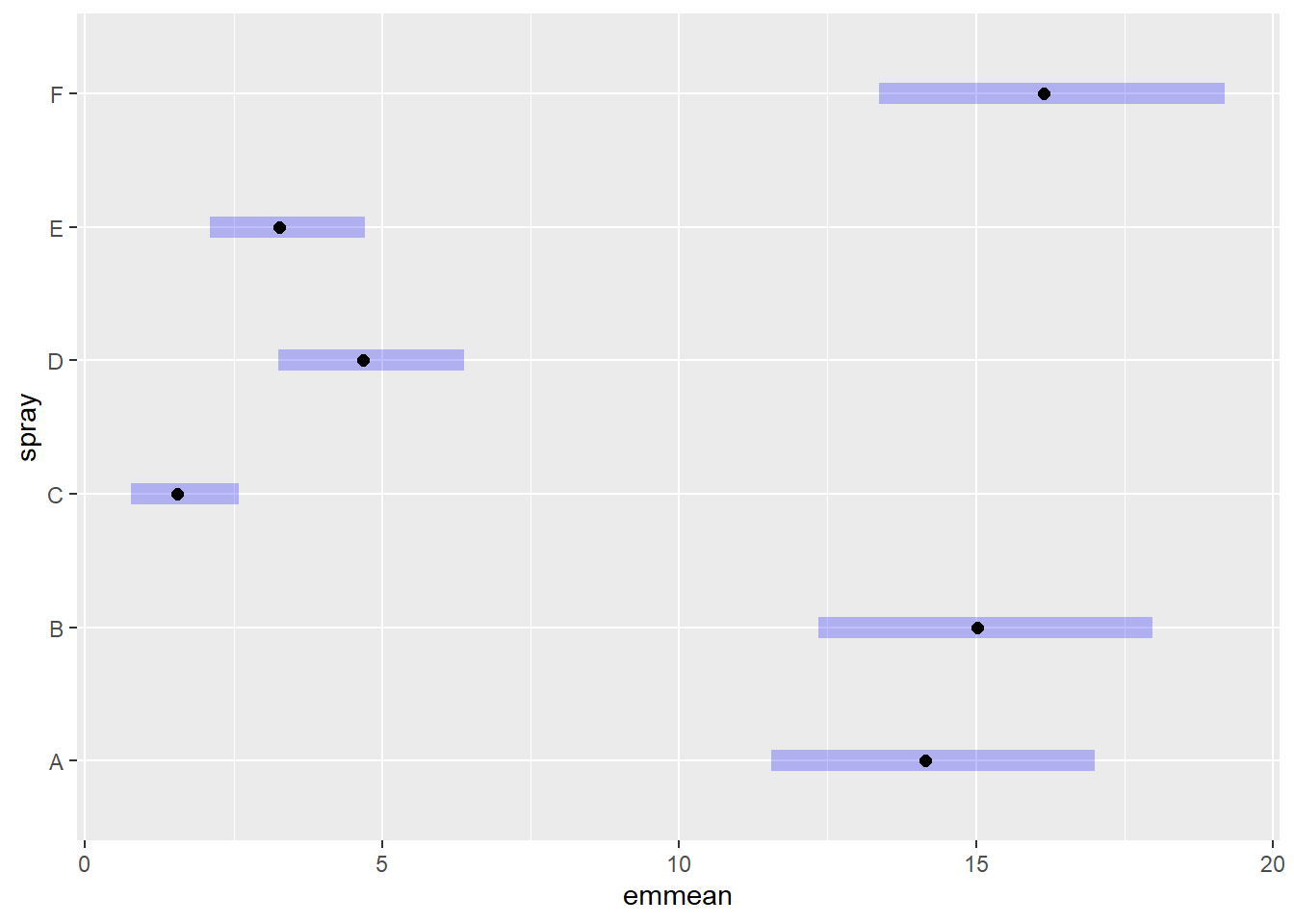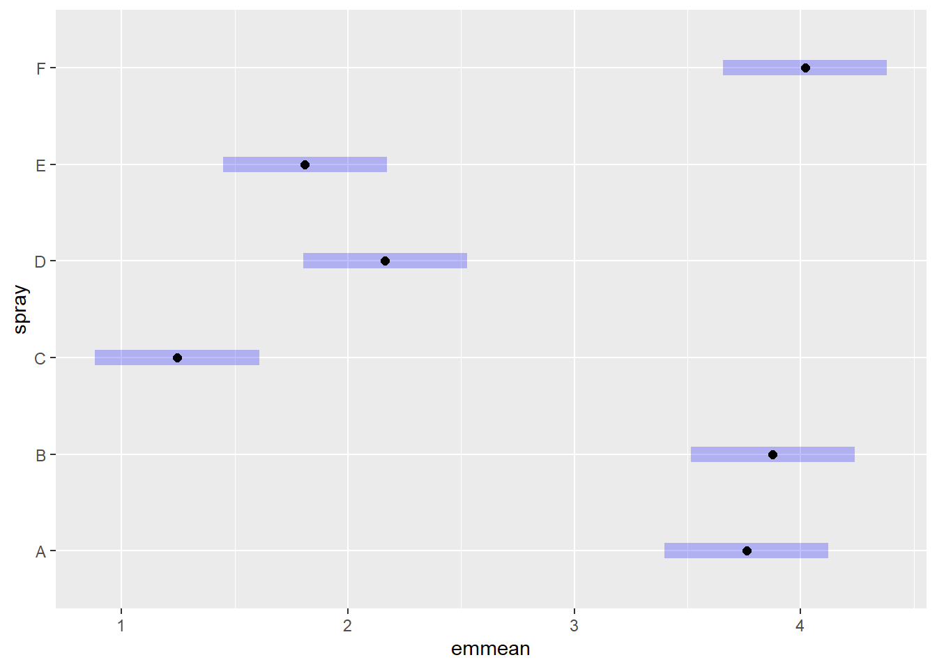 Para comparar os efeitos dos diferentes tipos de spray, as médias ajustadas pelo modelo são calculadas com a função emmeans() (usando type = "response" para trazer os valores na escala original da contagem). Em seguida, a função cld() do pacote multcomp exibe as letras de agrupamento, indicando quais grupos diferem significativamente entre si com base no método de Tukey: